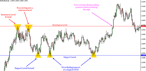 However, in practice traders rarely use single support or resistance to make trading decisions. They search for support or resistance levels which are delineated by several support or resistance points. The more a support/resistance level is tested, the more accurate it is. Support and resistance levels are more likely to look like in the picture below. With some practice you will also learn to master this handy tool.