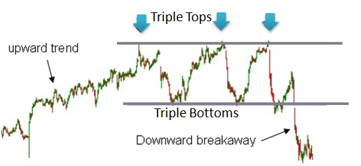 In the typical triple top formation each one of the heads is about the same size. A line of resistance can be drawn connecting the three tops. A neckline should be drawn connecting the support levels. After the third head, price falls below the neckline. The market may rebound for a short attempt at breaking back past the neckline only to be followed by the start of a new downward trend. The same is applicable for the Triple bottom.