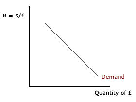 Let's use the normal downward sloping demand curve graph to measure the price of the pound-USD exchange rate-on the vertical axis. Moving up on the vertical axis indicates an increase in price of the pound, which is equivalent to a fall in the price of the dollar. Similarly, movements down the vertical axis represent a decrease in the price of the pound.