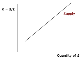 The supply curve slopes up because British firms and consumers are willing to buy a greater quantity of American goods as the dollar becomes cheaper (i.e. they receive more dollars per pound). Before British customers can buy American goods, however, they must first convert pounds into dollars, so the increase in the quantity of American goods demanded is simultaneously an increase in the quantity of foreign currency supplied to the United States.
