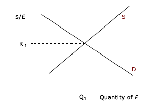 Suppliers and consumers meet at a particular quantity and price at which they are both satisfied. This graph combines the supply and demand curves. The intersection determines the market exchange rate and the quantity of dollars supplied to United States. At the exchange rate R, the demand and supply of British pounds to the United States is Q.