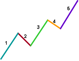 Elliott's theory states that in "trending markets" there are 2 patterns that form. The waves look similar to as shown in the image. We have added some color to simplify which part of the wave is associated to a number.