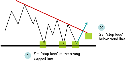 For example as shown in the illustration below, the currency pair creates a strong support level and a trend line, subsequently breaking the trend line. At this point your technical analysis shows two stop loss possibilities. Now it is up to the traders discretion to choose one or the other.